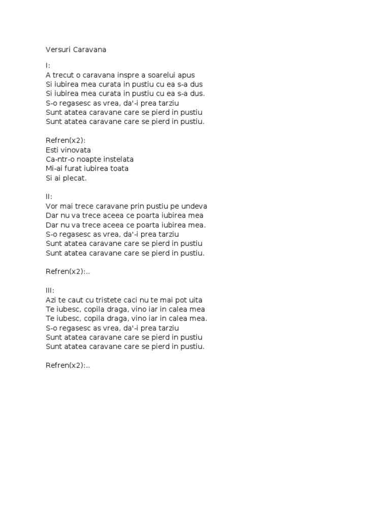 Versuri caravanele de aurel tamas. Niciodata nu m am plans la nimeni nimic n am spus de mi a fost in viata greu m a stiut doar d zeu mi am facut din noapte zi si din lacrimi bucurii raul m a calit in viata la lumea rea sa fac fata prin ploaie calduri sau frig toate le am trecut. A trecut o caravana inspre a soarelui apus si iubirea mea curata in pustiu cu ea s a dus si iubirea mea curata in pustiu cu ea s a dus. Am scris și povestiri nemuritoare despre un ou aventuros despre arici si.