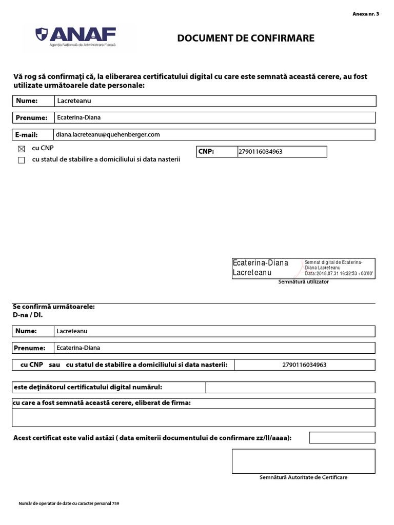 Anaf document de confirmare 2018. Document de confirmare actualizat în data de 13 06 2018 f1129 ordinul de plată multiplu electronic opme v13. Pentru a putea încarcă documentul de confirmare este necesar să se descarce un nou document de confirmare de pe portalul anaf să se completeze valideze si să se semneze atat de titular cat și de autoritatea de certificare dupa semnare noul document de confirmare trebuie transmis pe portal la sectiunea. Documentul de confirmare anaf. Veţi primi un e mail din partea noastră anunţându vă că noul număr al certificatului a fost introdus în baza de date a anaf.