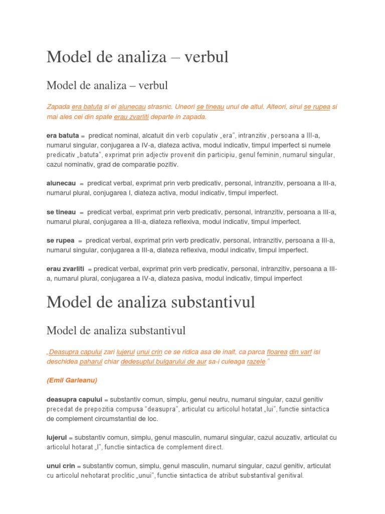 Pentru funcția sintactică este nevoie de o propoziție. Rezolva testele online din limba romana pentru autoevaluare persoanala. în actuala versiune analizatorul scoate în evidență verbele dar și unele cuvinte strâns legate de acestea pronume adverbe restul cuvintelor primind etichete morfosintactice fără ca ambiguitățile să fie tratate în toate cazurile. Substantivul model de analiza.