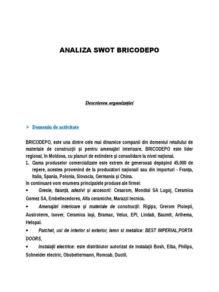 Termene de livrare preavize de modificare pre t s i de introducere produse noi. 2 analiza swot la banca comerciala romana 3 mix si analiza swot in firma smile travel braila. Cunoastere foarte buna a pietei producatorilor de materiale de constructii. Targete s i bonusuri progresive in func t ie de realiz a ri.