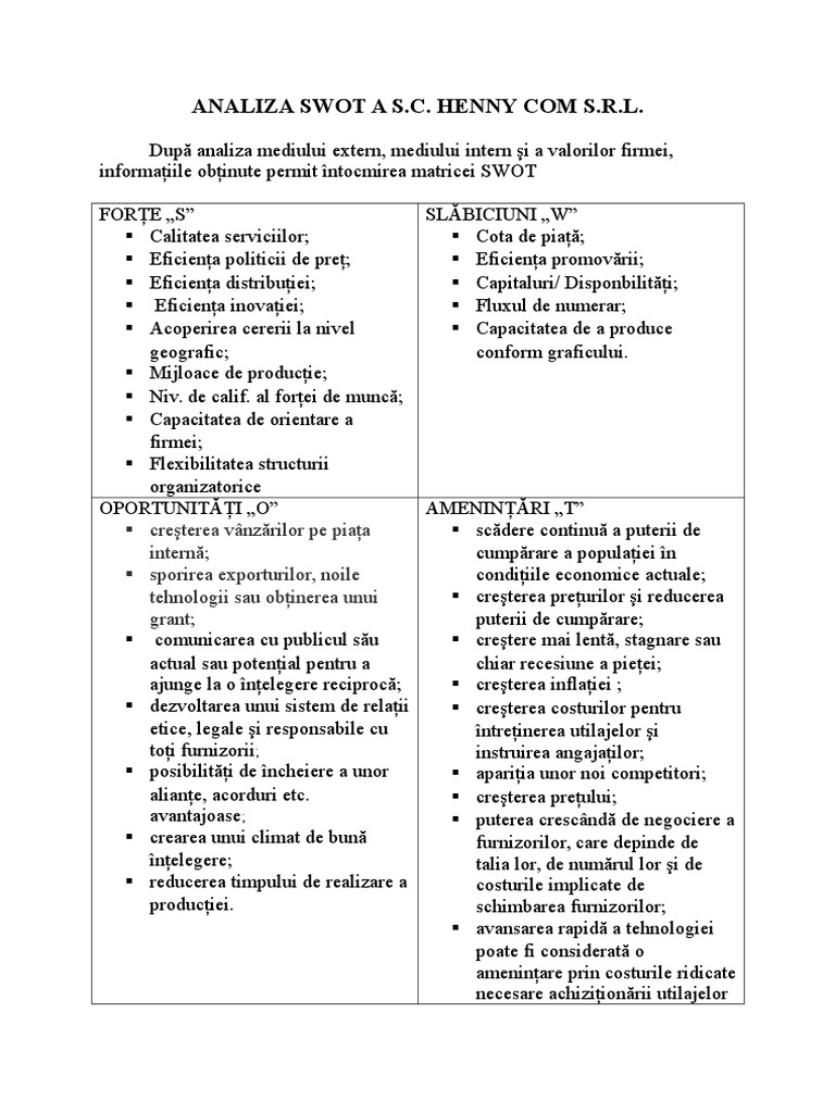 Analiza swot a unei firme amenintarile sunt factori de mediu externi negativi pentru firma cu alte cuvinte situatii sau evenimente care pot afecta nefavorabil in masura semnificativa capacitatea firmei de a si realiza integral obiectivele stabilite determinand reducerea performantelor ei economico financiare. Anliza swot a s c. Astfel analiza swot constituie cea mai importanta tehnica manageriala utilizata pentru intelegerea pozitiei strategice a unei noutati deschidere sesiune pentru depunerea cererilor de proiecte în cadrul sdl a teritoriului gal valea prutului apel selecție sm 19 2 măsura m2 3a procesarea producției agricole. Analiza swot se realizeaza in general in prima faza a proiectului astfel incat elementele de analiza pot alcatui baza planului de proiect si pot fi folosite ulterior in cadrul proiectului daca acesta intampina dificultati in ceea ce priveste planificarea livrabilele sau bugetul alocat si trebuie readus pe linia de plutire.