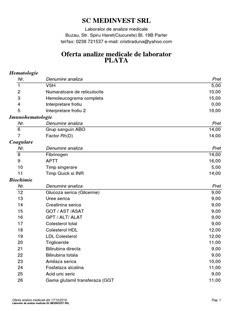 Preturi analize laborator alegeti specialitatea pentru a afisa lista analizelor de laborator. Timpul mediu de asteptare este calculat din momentul in care apelul intra in coada de asteptare si pana esti preluat de un operator. Fie că vrei să ți faci analize medicale anuale analize de sânge pentru alergii sau un set de investigații uzuale și complete recoltarea de sânge sau recoltarea produselor biologice și patoligice se face la cele mai înalte standarde de excelență. Oferim peste 2 300 de investigații de laborator diferite tipuri de analize și teste de sânge.