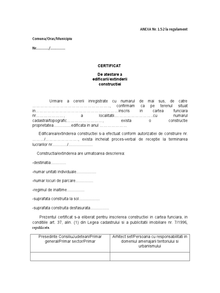 Anexa 17 certificat atestare edificarii constructiei. începeți perioada gratuită de probă anulați oricând. în cazul construcţiilor pentru care execuţia lucrărilor s a realizat fără autorizaţie de construire iar împlinirea termenului de prescripţie prevăzut la art. 31 nu mai permite aplicarea sancţiunilor certificatul de atestare adeverinţa privind edificarea construcţiei va fi emis emisă în baza unei expertize tehnice cu privire la. Copie după actul de identitate.