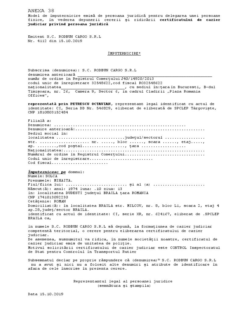 De asemenea sus numitul va ridica în numele societăţii noastre certificatul de cazier judiciar emis de unitatea de poliţie. Anexa 38 la h g. Certificatul de cazier judiciar se elibereaza persoanelor juridice in cel mult 3 zile de la data solicitarii. Motivul solicitării certificatului de cazier judiciar este.