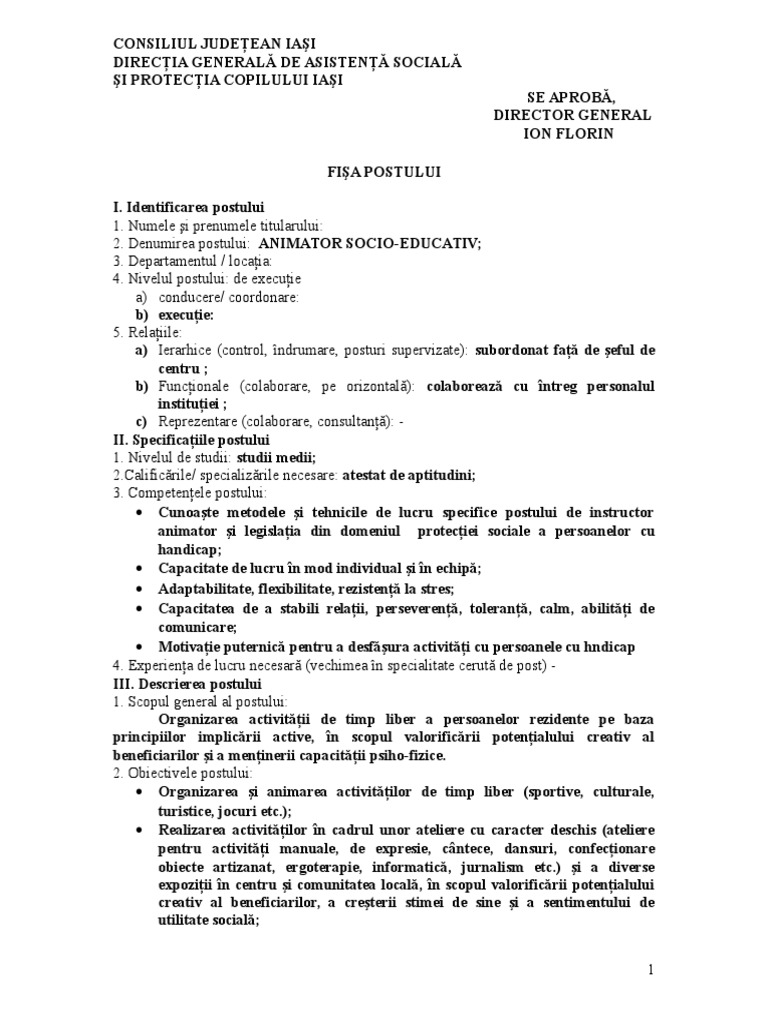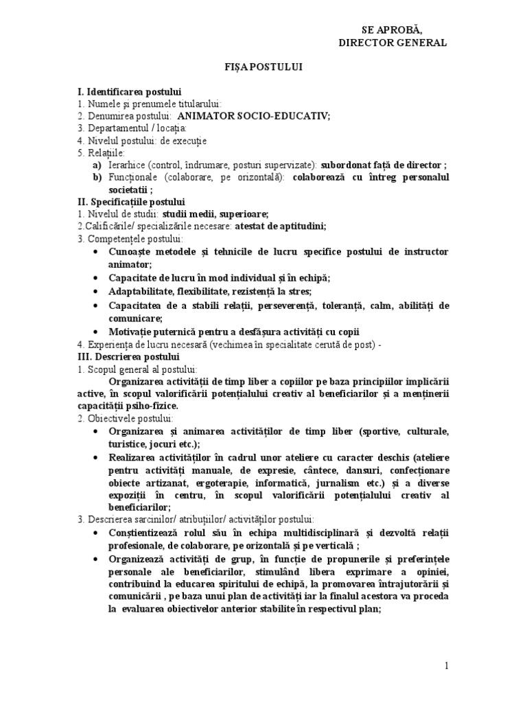 Animator socio educativ fisa postului. Buna ma poate ajuta cineva cu o fisa postului pentru animator socioeducativ cor 516907 mai exact animator la o sala de joaca ofer fundita. 4 din 30 unităţi de competenţă domeniu de competenţă nr. Fișa postului animator denumirea postului animator subordonare responsabil administrativ director executiv al asociaţiei este înlocuit de persoană desemnată de către responsabil administrativ director executiv al asociaţiei relaţii funcţionale are relaţii cu. Director general fia postului i.