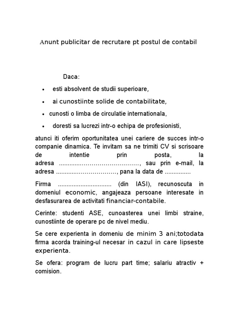 Buna ziua va rog ma puteti ajuta cu un model de anunt pentru angajari. Anunt de angajare model pe 5 mai 2020 8 mai 2020 dacă vrei să publici un anunț pentru a recruta oameni care să lucreze în compania ta trebuie să redactezi anunțul astfel încât candidatul să primească informații cât mai detaliate. Vineri 22 sept 2017 share. Ce trebuie sa contina un anunt de angajare.