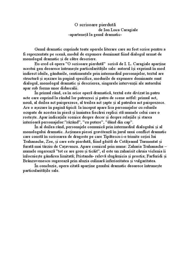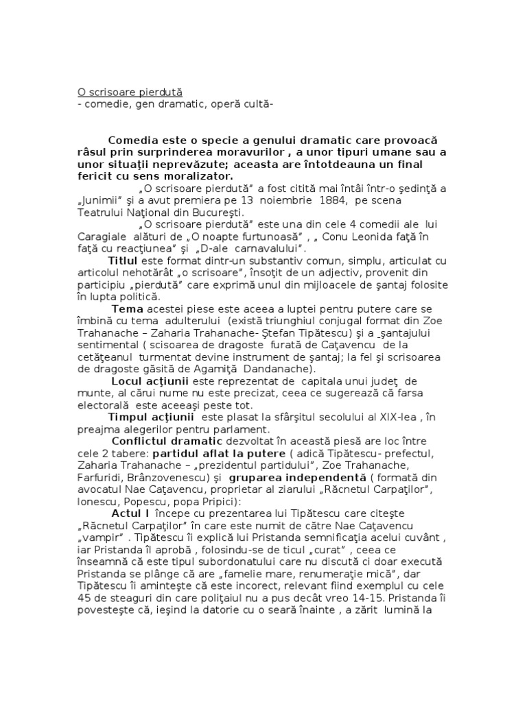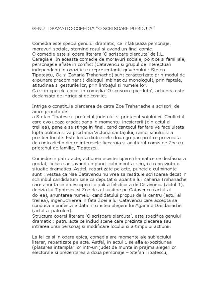 Apartenenta la genul dramatic o scrisoare pierduta. Existenta conflictului dramatic principal in o scrisoare pierduta se declanseaza odata cu pierderea scrisorii e amor de catre zoe evolueaza pe masura ce nae catavencu ii santajeaza pe tipatescu zoe si trahanacje cu publicarea scrisorii atinge punctul culminant la pronuntarea candidaturii lui dandanache si se stinge cand zoe reintra in posesia scrisorii. Caragiale la genul dramatic specia literara comedie. Apartenenta operei o scrisoare pierduta de i. Genul dramatic cuprinde totalitatea operelor scrise cu scopul de a fi ulterior interpretate pe scena unui teatru.