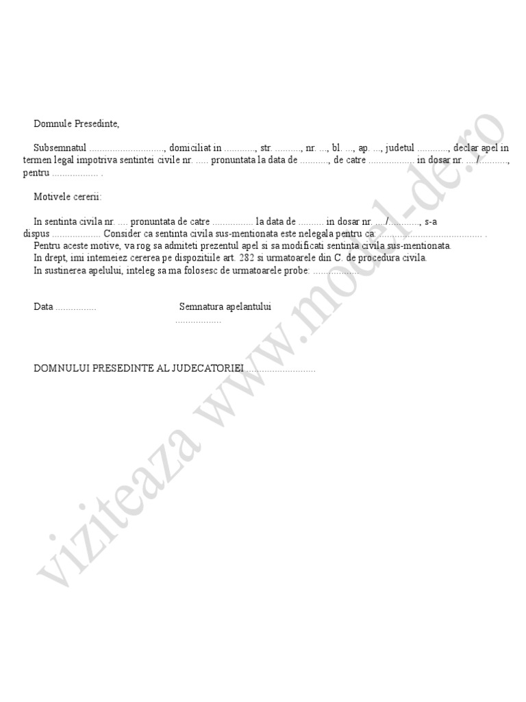 Apelul incident 1 intimatul este în drept după împlinirea termenului de apel să formuleze apel în scris în cadrul procesului în care se judecă apelul făcut de partea potrivnică printr o cerere proprie care să tindă la schimbarea hotărârii primei instanţe. Model cerere de apel împotriva sentinței civile instanța. Thrive un documentar inedit ce trebuie vizionat urgent pana nu va disparea de pe internet. Model apel impotriva sentintei civile.