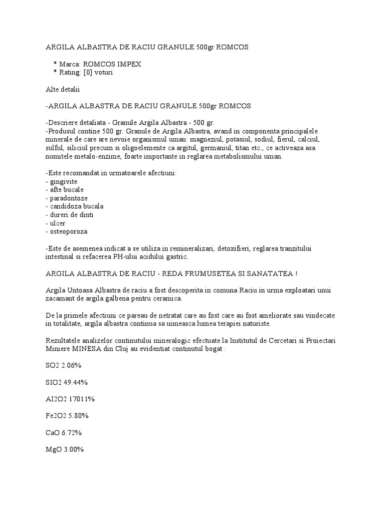 Lasă amestecul să stea peste noapte apoi bea l cu o jumătate de oră înainte fiecărei mese. Analizele efectuate de institutul national de recuperare medicina fizica si balneoclimatologie directia de sanatate publica mures centrul de sanatate publica tirgu mures si institutul de cercetari si proiectari miniere minesa din cluj napoca arata ca argila albastra de raciu are in componenta nu mai putin de 41 de minerale si oligoelemente fiind in acest moment datorita acestui continut. Argila este un remediu natural pretios pentru sanatate. Cura de baza si cura de intretinere.