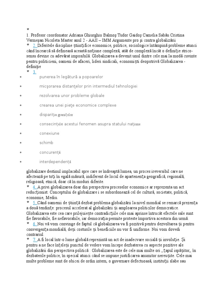 Arhiva contine 1 fisier doc de 7 pagini. Mai jos poate fi vizualizat un extras din document aprox. Acest referat descrie argumente pro si contra globalizarii. Profesor coordonator adriana ghiurghiu balmoş tudor gaidoş camelia sabău cristina vermeşan nicoleta master anul 2 aaii imm argumente pro şi contra globalizării 2.