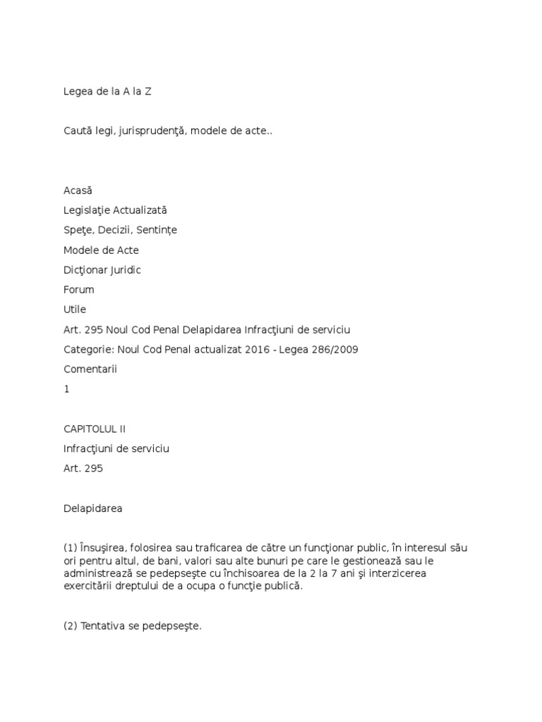 Art 295 cod penal. 295 din codul penal. 295 delapidarea 1 insusirea folosirea sau traficarea de catre un functionar in interesul sau ori pentru altul de bani valori sau alte bunuri pe care le gestioneaza sau le administreaza se pedepseste cu inchisoare de la 2 la 7 ani si interzicerea exercitarii dreptului de a ocupa o functie publica. 2 tentativa se pedepseste. 295 din codul.