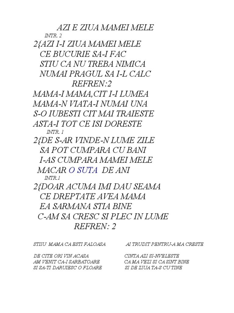 De asemenea în alte state ziua mamei este celebrată la 8 martie de ziua internaţională a femeii sau la 21 martie în prima zi de primăvară. Toate florile din lume ti le as da maicuta mea. Nu trebuie confundată cu ziua de 8 martie. Grijulie si duioasa nu ma lasi sa simt ce i greu si zambind mereu voioasa esti tot timpu n jurul meu si zambind mereu.