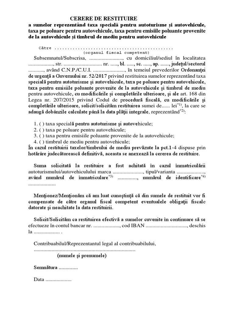Timbrul de mediu pentru autovehicule. Guvernul a simplificat modalitatea de restituire a taxei auto si a timbrului de mediu joi 29 martie 2018 ora 16 51 guvernul a eliminat joi prin ordonanta de urgenta obligativitatea de a anexa la cererea de restituire a taxei auto ori a timbrului de mediu a documentelor privind plata taxei certificatul de inmatriculare si cartea de identitate a masinii. Articole din restituire taxe auto scrise de avocatilicitatiijuridice. Taxa auto restituire taxa auto dobanzi taxa auto fiscul a anunțat luni seară că a dat înapoi celor care au depus cereri de restituire aproape toți banii încasați din fostele taxe auto.