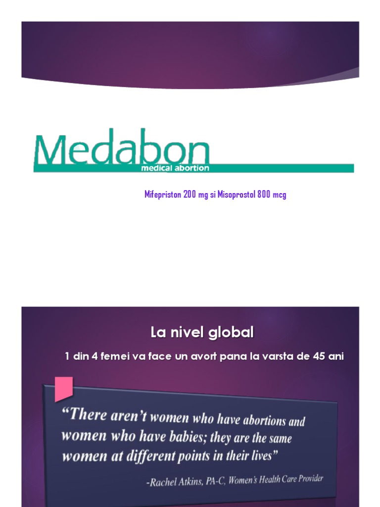 Mifepriston și misoprostol pot fi utilizate în siguranță la domiciliu în primele 9 săptămâni de sarcină. Avortul medicamentos este o metod ă nechirurgicală de întrerupere a sarcinii prin administrarea unei substanțe care are efect anti progestativ adică blochează efectele progesteronului hormonul care contribuie la menținerea sarcinii fapt ce duce la oprirea sarcinii din evoluție combinată cu administrarea unei substanțe care are efect de stimulare a contracțiilor uterine ceea ce. Avortul medicamentos se poate face folosind urmatoarele medicamente. De asemenea in loc de a se lua oral pastila de misoprostol medicamentul este introdus in vagin.