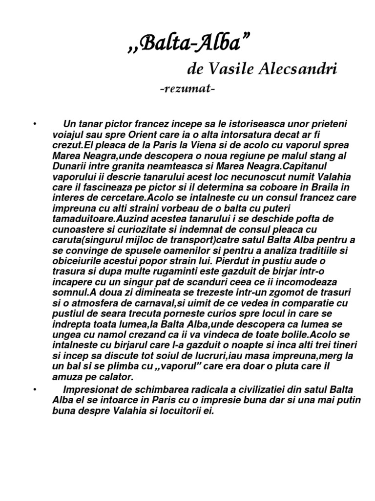 Balta alba de vasile alecsandri. Genul journalistic fusese ilustrat de stendhal flaubert. Balta alba vasile alecsandri balta alba este un jurnal de calatorie o fiziologie colectiva si sociala alaturi de borsec si iasii in 1844 genul journalistic fusese ilustrat de stendhal flaubert. Alecsandri balta alba download as word doc doc docx pdf file pdf text file txt or read online. Vasile alecsandri reprezentant de seamă al generaţiei de scriitori paşoptişti de la mijlocul secolului al xix lea a abordat în creaţia sa o mare varietate de specii literare scriind poezie proză şi dramaturgie punând astfel temelia literaturii române în toate genurile literare.