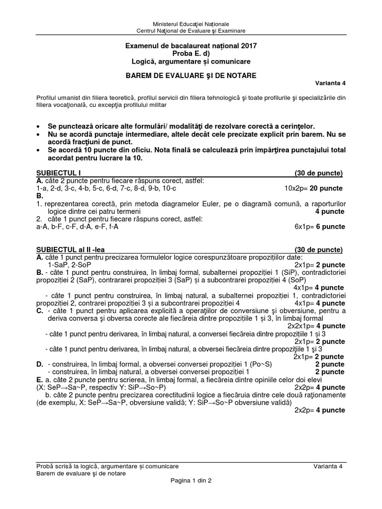 Barem bac logica 2017. Logică variantă e d logica 2017 barem e d logica 2017. Se elimină regula diferenţei de 50 de sutimi astfel că nota va fi modificată şi dacă între nota iniţială şi cea după contestaţie este o diferenţă mai mică de 50 de sutimi. Jitaruionelblog pregatire bac si evaluarea nationala 2020 la matematica si alte materii. Subiectele la română.