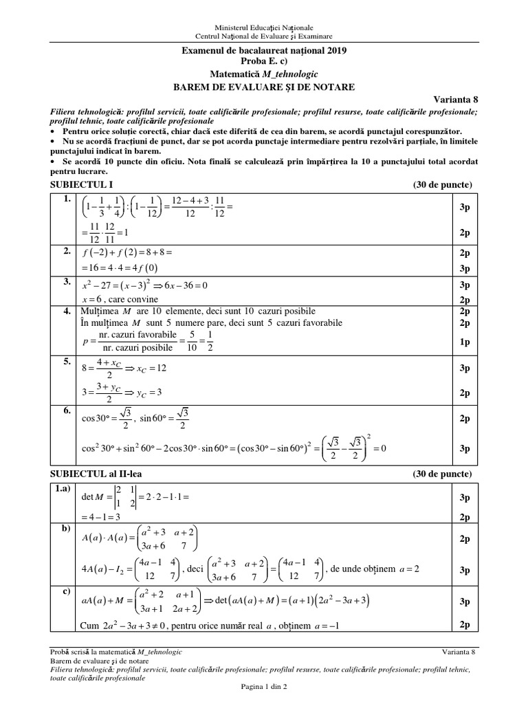 Barem bac matematica 2019 tehnologic. Pe baza baremului de mai jos absolvenții de liceu care au susținut astăzi proba obligatorie a profilului vor fi evaluați și notați la examenele de astăzi. Barem bac matematica m tehnologic sesiunea august 2019. Dacă doriți de descărcați subiectele și baremele de la matematica și istorie sunt mai jos. Pentru a putea promova examenul de bacalaureat 2019 candidații trebuie să susţină toate probele de evaluare a competenţelor lingvistice şi digitale să susţină toate probele scrise şi să obţină minimum nota 5 la fiecare dintre acestea iar media generală la bac 2019 să fie cel puțin 6.