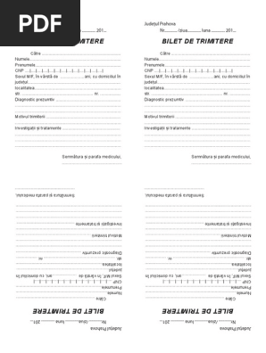 Bilet de trimitere model pdf. Medicii sunt obligati sa asigure utilizarea formularului de bilet de trimitere pentru investigatii paraclinice care este formular cu regim special unic pe tara si sa recomande investigatiile paraclinice in concordanta cu diagnosticul ca o consecinta a actului medical propriu numai pentru serviciile medicale care fac obiectul contractului cu casa de asigurari de sanatate. Bilet dc trimitero pentru investigatii paraclinicc docontate de cas servicii dc ina tä porformantå scintigrafie diagnostic sedili localitate str nr. Bilet de trimitere cu plata author. Dovada calitatii de asigurat cupon pensii adeverinta de asigurat co asigurat.