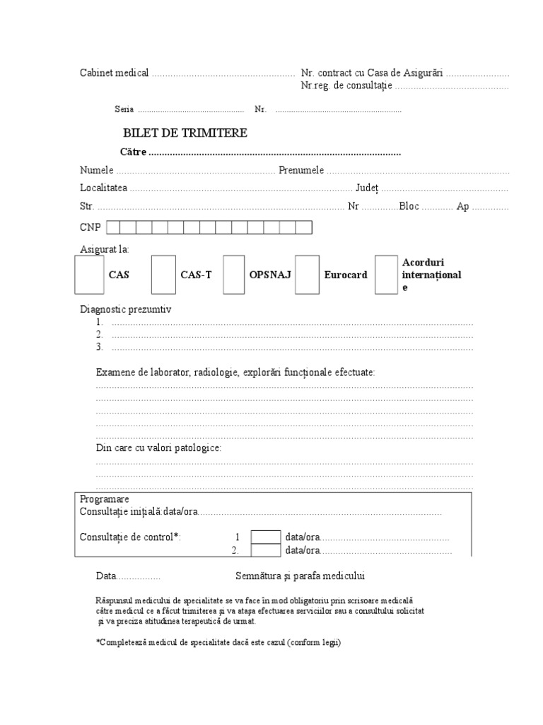 Tipografie formulare tipizate bilet de trimitere preturi avantajoase. Concret de la 1 aprilie 2015 noul model de bilet de trimitere va fi folosit de către medici şi pentru prescrierea analizelor medicale recomandate copiilor cu vârsta cuprinsă între 2 şi17 ani inclusiv precum şi pentru persoanele asimptomatice cu vârsta de 18 ani şi peste în cursul consultaţiilor preventive analize a căror contravaloare va fi suportată de către furnizorii de. Bilet de trimitere descarcă fișierul în format pdf. Specializati in sectorul public va punem la dispozitie toate variantele tipizate in acest segment.